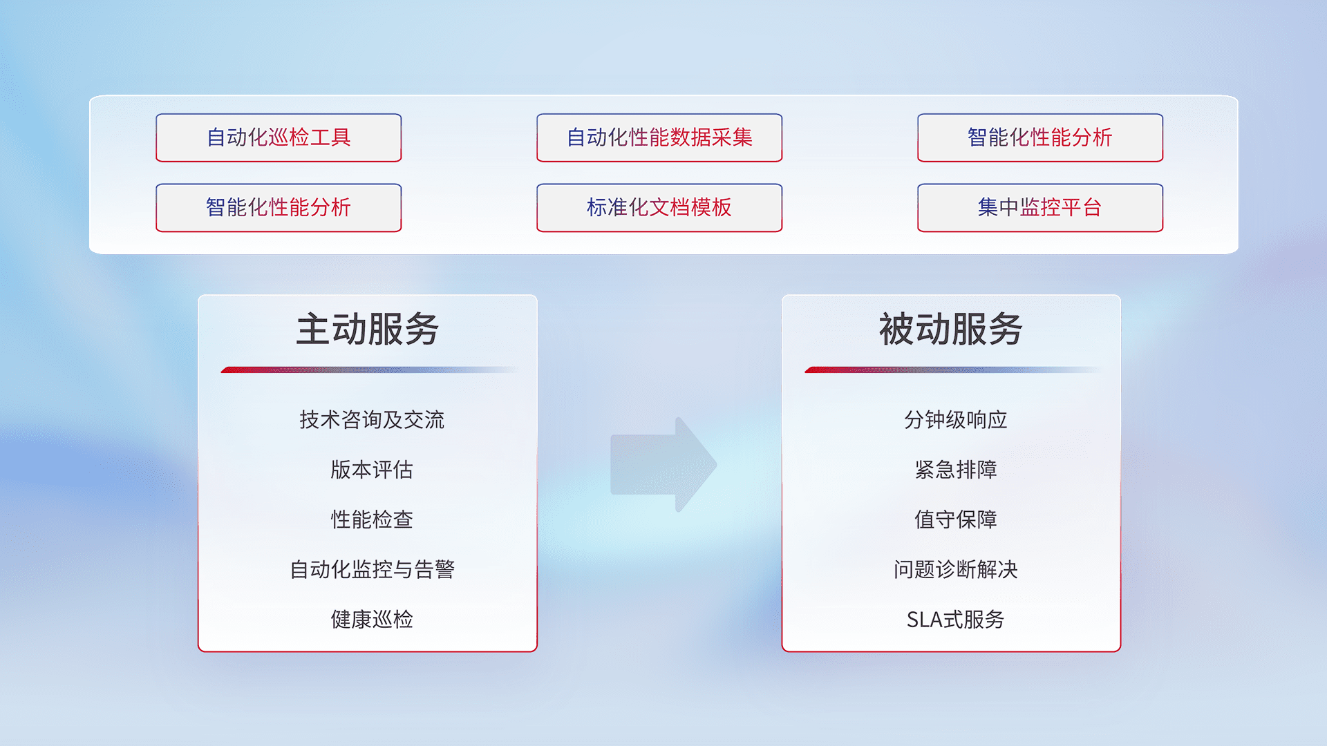 智能化工具和标准化文档,,,保障服务质量,,提供主动服务(包含技术咨询、、版本评估、、、、性能检查、、自动化监控与告警、、健康巡检)和被动服务包含(分钟级响应、、紧急排障、、、值守保障、、问题诊断解决、、、SLA服务)。。。
