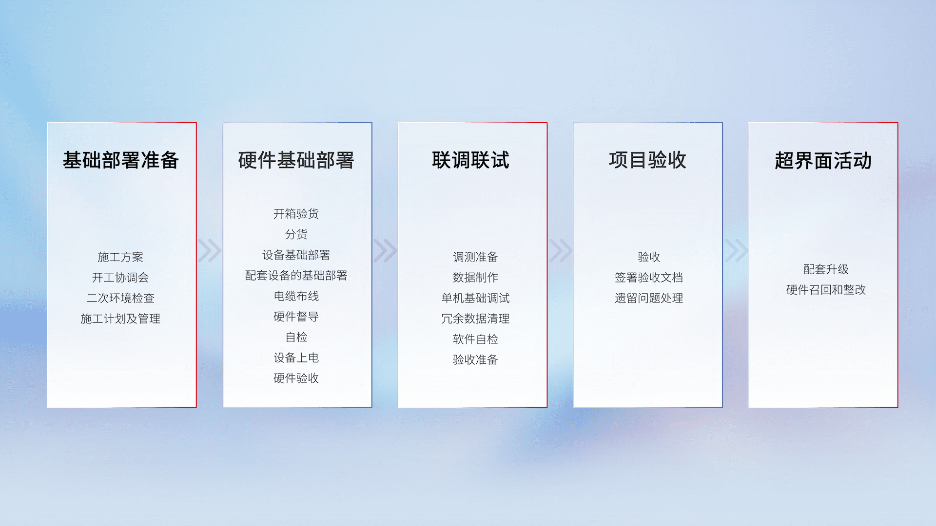 从基础部署准备、、硬件基础部署、、、联调联试、、、项目验收、、、越界面活动的全过程可追溯,,保证施工质量和进度。。。